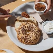 Bagel de panceta crocante, queso cremoso, cebolla caramelizada, tomate asados