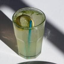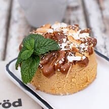 Café grande o té, jugo de naranja o limonada (250 ml) porción de torta del día