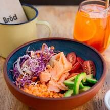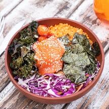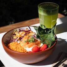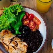 Pollo marinado y grillado, tzatziki, arroz yamani, porotos negros, repollo curado, tomate, durazno y semillas de zapallo tostadasPollo grillado, quinoa, palta, coleslaw, ají dulce y cebolla pickle con salsa de maní